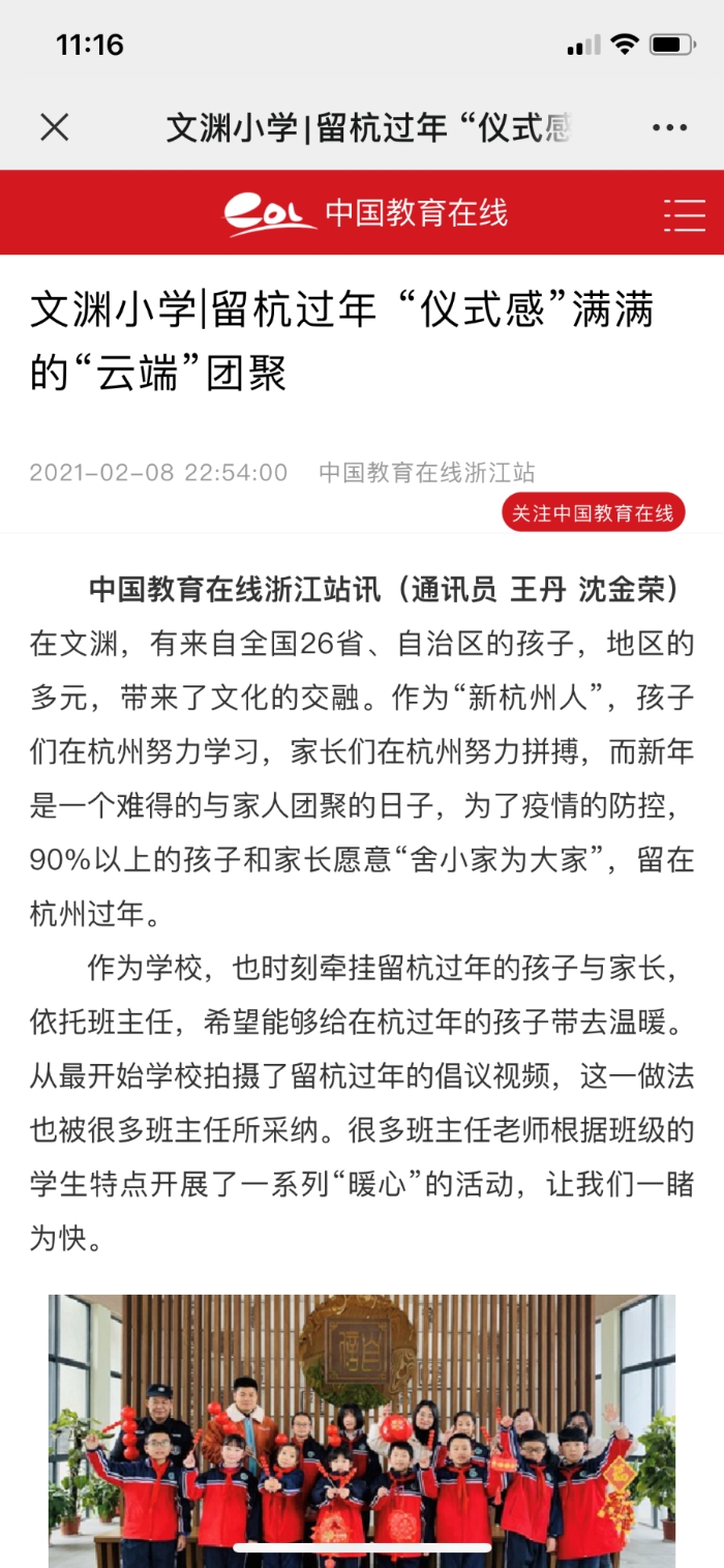 中国教育在线特别报道了班主任老师根据班级的学生特点开展了一系列有“烟火味”的活动。六(7)班和四(1)班的班主任老师组织孩子们开展了“云视频团聚”的活动,除了把祝福传给远方的亲人,大伙儿也在班级群里过了一个热闹的年。部分班主任因为学生不能回老家,体验不到“放鞭炮”的快乐,组织孩子们开展了“云装饰”的活动,增加喜庆的年味,群里pk更是增加了孩子们的兴趣。六(1)班和六(10)班的班主任老师更是以留杭过年为契机,让孩子们分享他们怀念的家乡年俗,给孩子们创造了一个了解中国多元文化的机会,孩子们涨知识了。