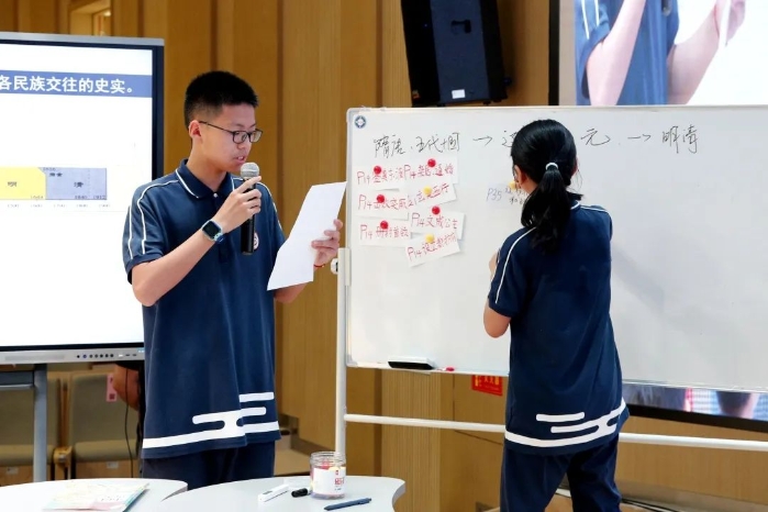 夏伊甸老师通过小组合作,让学生组内分工,自主预学、梳理从隋唐到明清的民族融合重大历史事件,并展开汇报。在学生的自主评价、自主纠错后,夏老师相机点拨,引入史实概念,明晰学科语言。