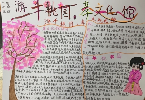 悟孝道,国学初体验传承孝悌为本的文化,在孝廉广场感悟成为一个孝顺的孩子。游览千桃园,观赏千姿百态的花朵各自争芳斗艳,游览皋亭山骑行道,欣赏桂花,感受风情小镇上的农家野趣,花儿伴着蝴蝶,孩子们活跃在大草坪上,分享着自己“快乐厨房”项目式学习中的成果,欢声笑语中结束一天的行程。