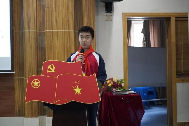 新当选大队委员代表唐家灏同学作了发言,表达自己的决心和目标。在场的领导还给2021学年度学校大队委员会委员们佩戴标志。