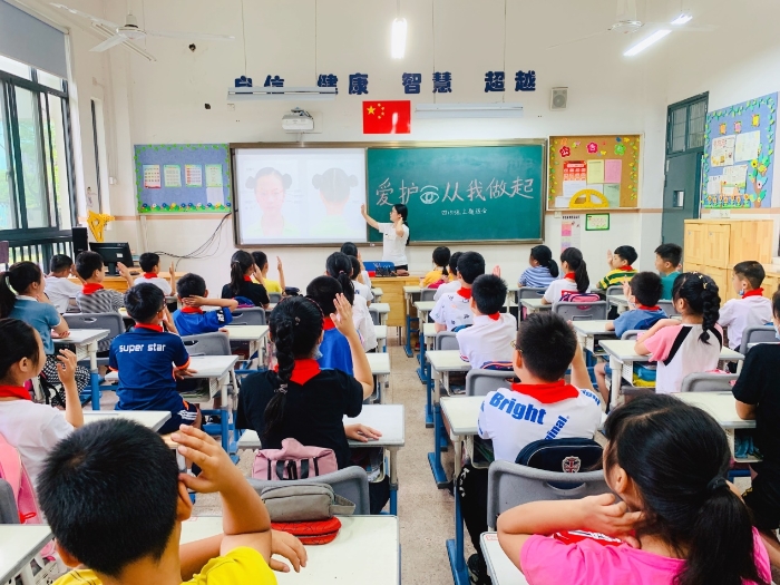 除了引进先进的科技资源,文渊小学通过德育处和卫生室两方合作,将视力保护融入到日常的教育教学工作中。卫生室老师每学期对学生视力进行监测,关注学生视力发展动态,并及时对视力下降的孩子们进行治疗与干预。视力保护重在预防,德育处将视力保护纳入德育工作,老师们通过班会课、队课的形式给孩子们普及护眼的相关知识,帮助孩子们提高护眼意识。同时,加强眼保健操的检查力度,从制度上去督促孩子们做好视力的保护。