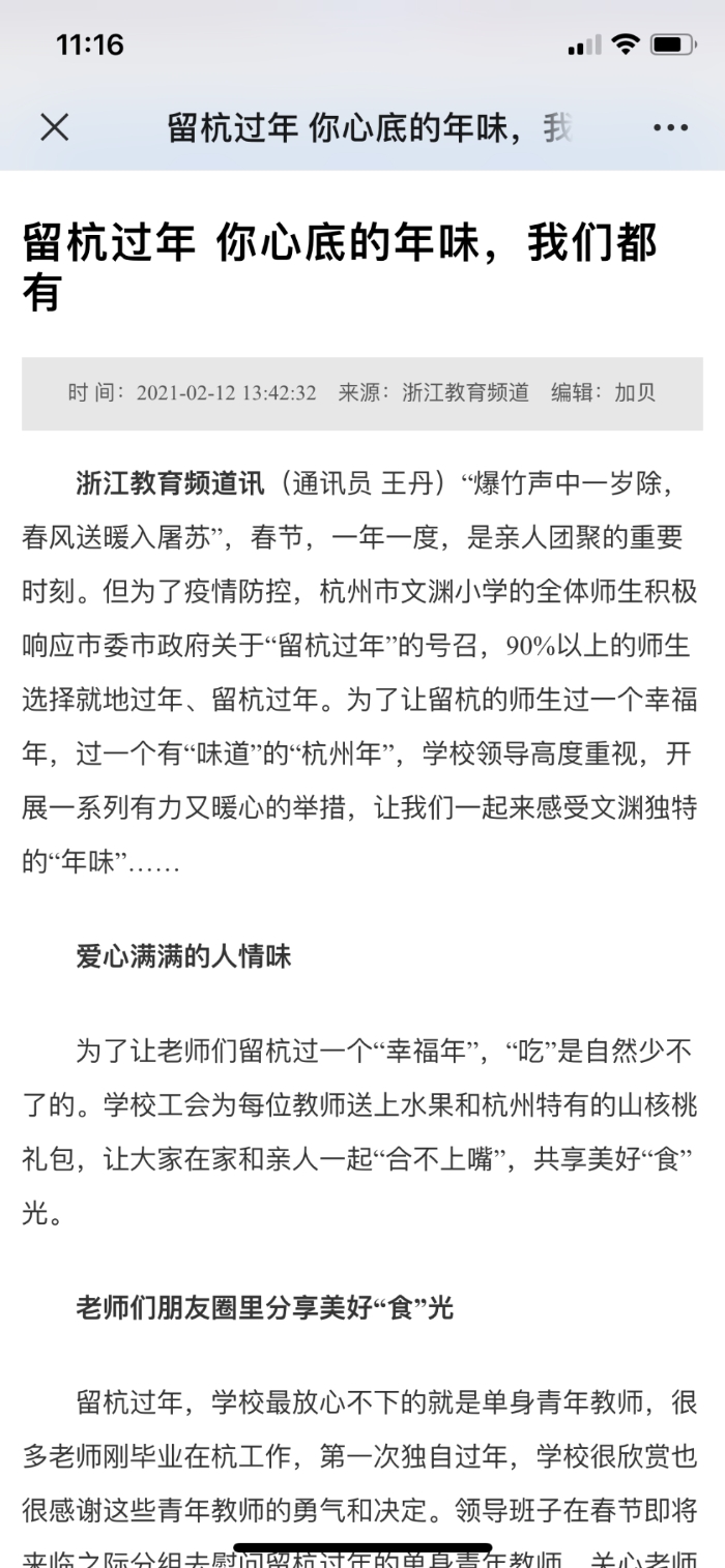 “爆竹声中一岁除,春风送暖入屠苏”,春节,一年一度,是亲人团聚的重要时刻。但为了疫情防控,杭州市文渊小学的全体师生积极响应市委市政府关于“留杭过年”的号召,90%以上的师生选择就地过年、留杭过年。为了让留杭的师生过一个幸福年,过一个有“味道”的“杭州年”,学校领导高度重视,开展一系列有力又暖心的举措,引来了各大媒体的持续关注……