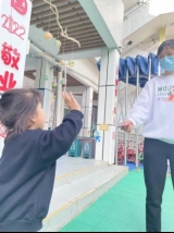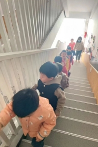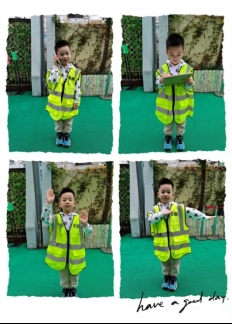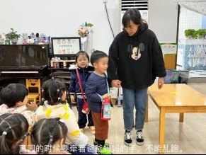小朋友们体验做一名小小安全员。上下楼梯都要注意安全。