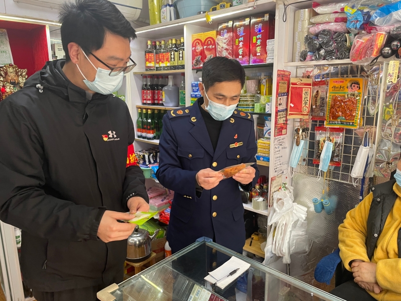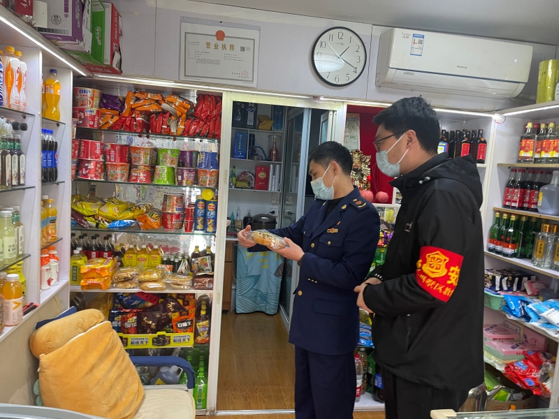 再给学生做完培训后,我校钱涛副校长和市场监管所一起到学校周边超市、小店进行走访,配合加强对食品安全的管理。