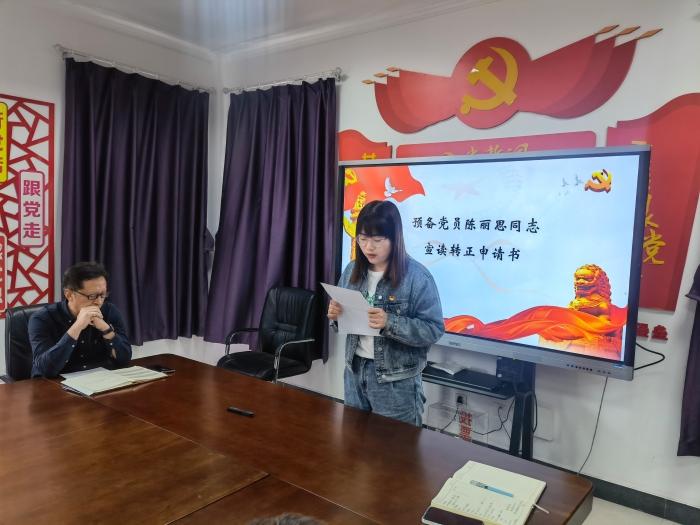 首先,陈丽思同志宣读了《转正申请书》,汇报自己在一年预备期内的思想、学习和工作等方面的情况。陈丽思老师结合工作实际,表达了自己对党的向往,也表明了对党和教育事业坚定的决心。