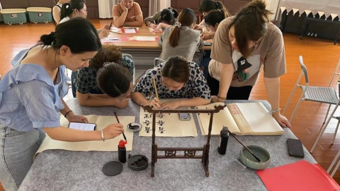 活动现场,长桌排开,笔墨铺就,教师们满怀激情,从习近平总书记一系列重要讲话、文章、谈话中所引用的教育论述进行书法创作。在书法活动现场,老师们认真准备,仔细书写。在创作过程中对习近平总书记关于教育的重要论述又进行了研读,一方面深入地学习了习近平总书记重要讲话精神,另一方面研习了优秀的传统文化、增强了文化自信。这样的书法过程可读、可学、可赏,一举多得。