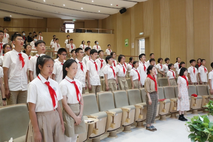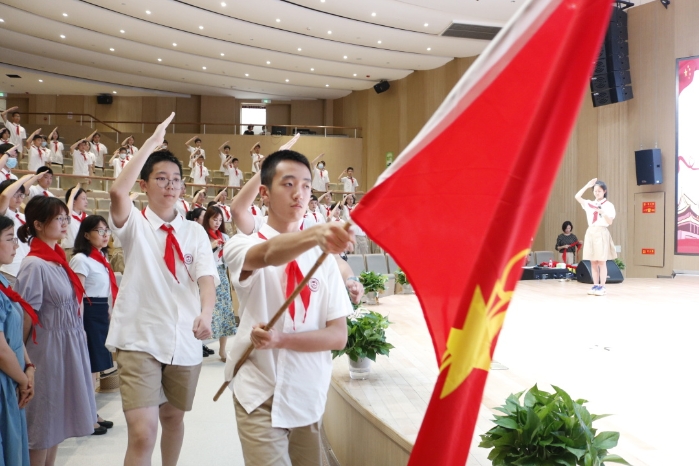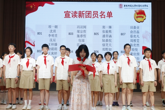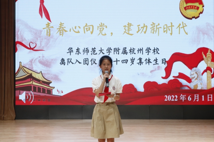 中国共产主义青年团团员,是中国共产党的助手和后备军。正值第72个六一国际儿童节,在建团100周年之际,八年级全体学生集结在火红的队旗下,举行华东师范大学附属杭州学校2022年“青春心向党,建功新时代”——八年级离队入团仪式暨14岁集体生日。党总支书记朱英应邀到场见证仪式完成,并对全体学生提出期许。