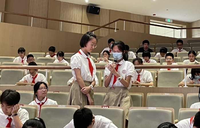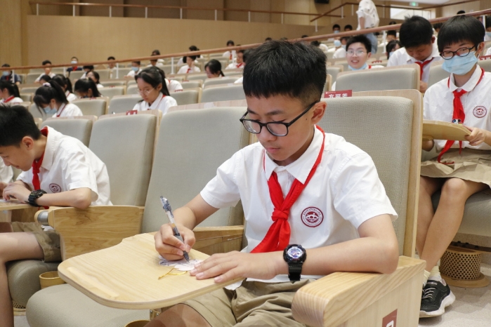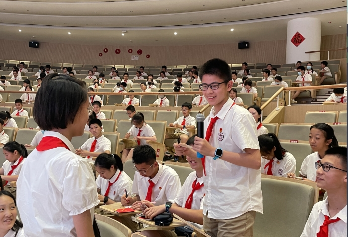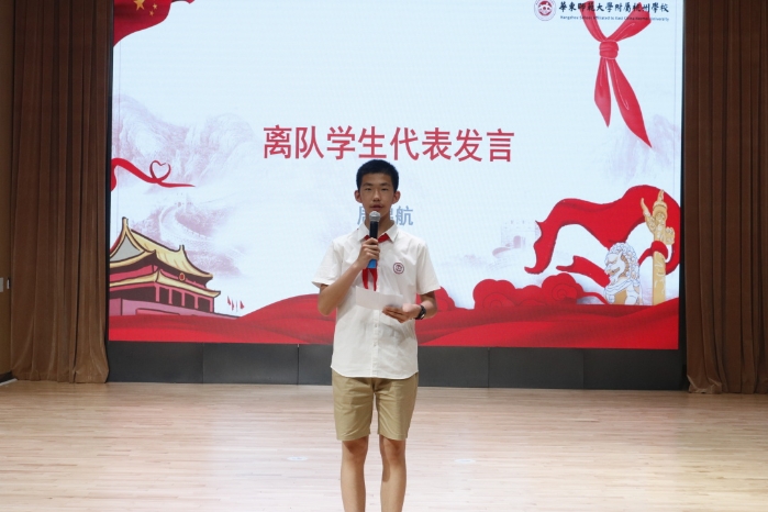 离队学生代表周锦航同学发言,感谢红领巾,见证了我们整个童年。华附学子也将不负红领巾,闪耀出独属于他们的的青春风采。