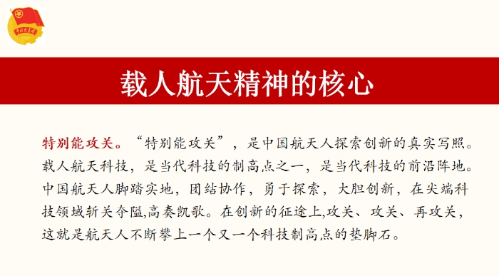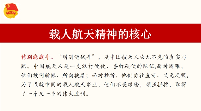 几代航天人奋斗拼搏凝聚而成的载人航天精神,不仅是托起飞天梦的精神之翼,更是全体中国人民的宝贵民族精神财富。“载人航天精神贵在‘特别’”,姜老师分享了载人航天精神的核心,即特别能吃苦,特别能战斗,特别能攻关,特别能奉献。其中,特别能吃苦,是由载人航天领域的特别工作环境锤炼而成的;特别能战斗,是由载人航天事业的高风险挑战历炼而成的;特别能攻关,是在抢占载人航天技术制高点奋斗过程中磨砺而成的;特别能奉献,是由航天人秉持的精忠报国理想信念铸就而成的。