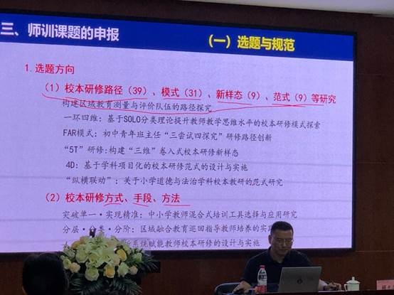 培训部吴小美主任强调了本次培训的目的并感谢杭州师范大学为我区量身定制了丰富的课程内容,鼓励校本负责人多参与,多向专家请教,多与同行交流。顾九华副主任从近两年各区师训课题立项数据出发,建议重视并推动区校两级科研培训制度、建设以研究方向为要素的实体科研机构、领跑教师教育大科研。顾教授详细讲解了师训课题申报可能存在的问题,根据问题从研究课题的来源到课题选题的标准,再到选题的基本方法和技巧,最后到选题的规范陈述。顾教授通过丰富的案例,深入浅出,牢牢抓住学员的注意力。