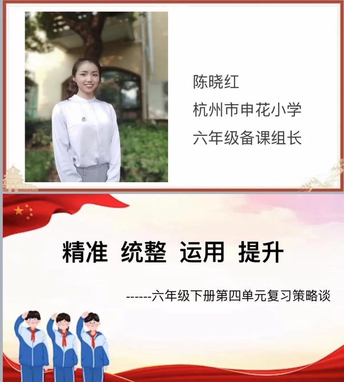 杭州市申花小学六年级备课组长陈晓红老师带来微报告《精准 统整 运用 提升——六年级下册第四单元复习策略谈》。陈老师从“复习依据”“复习过程”“复习成效”三个方面介绍自己学校备课组的单元复习经验,她们基于课程理念统整单元内容,立足统编教材,关注学情中的易错点和提升点来设计单元复习框架;从整理梳理、夯实基础到聚焦要素、运用提升,再到多元表达、进阶思维,层层深入地复习;并结合过程性评价量表和总结性评价量表提升学生的综合素养。陈老师的分享为老师们在毕业复习中开展单元统整复习提供了很好的范本。