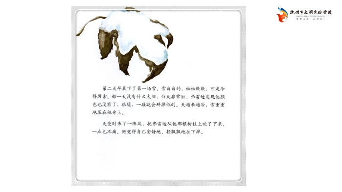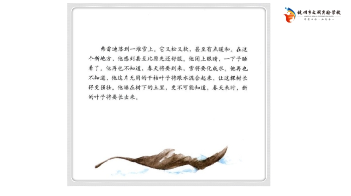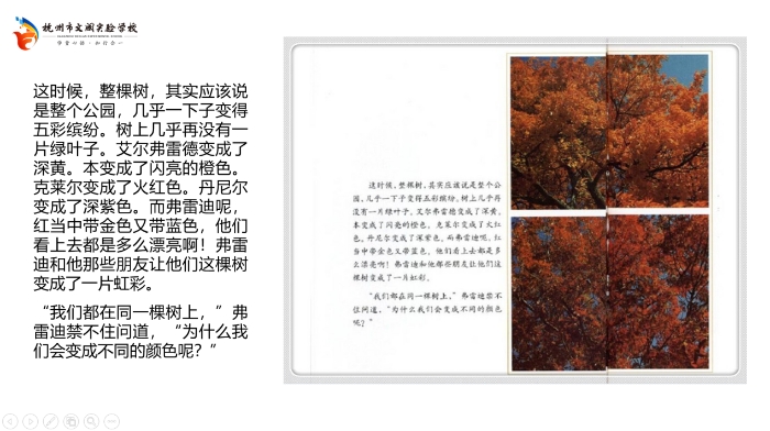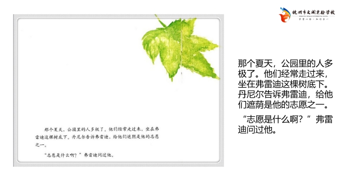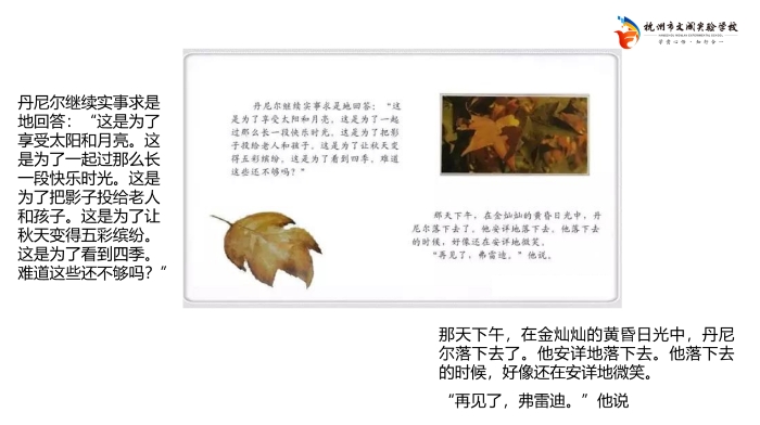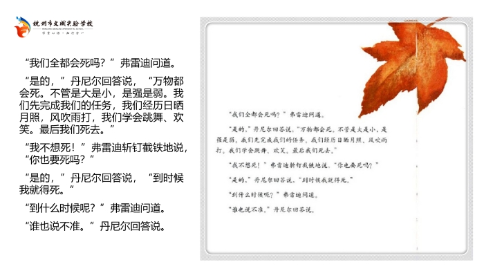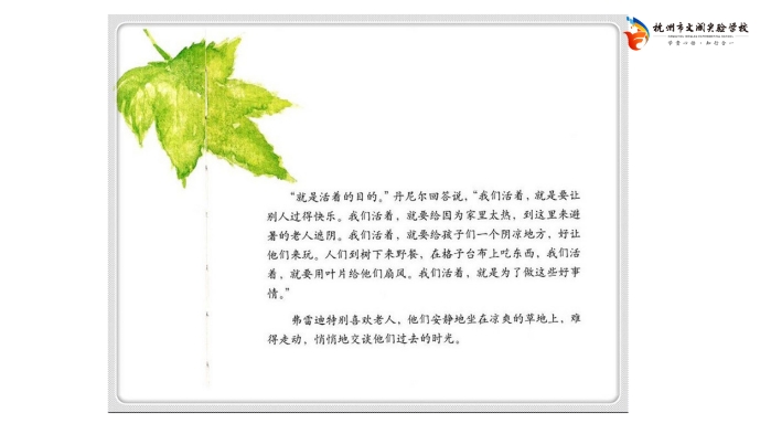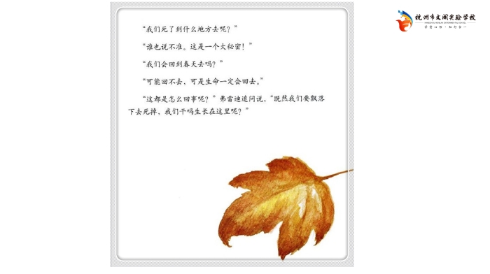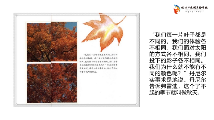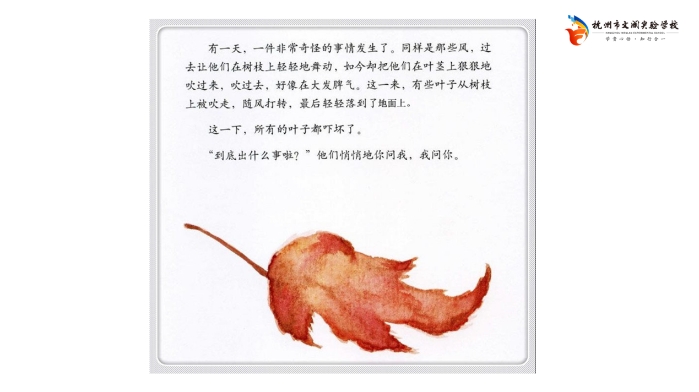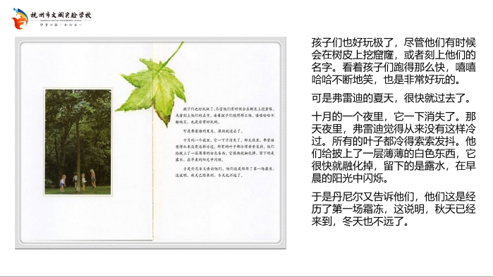 爸爸妈妈读完绘本后,可以向孩子提一些问题,引发他们对生命的思考。比如:“丹尼尔认为活着的目的是什么?你同意吗?你有什么想法?”“霜冻给树叶带来了什么?经历了霜冻(挫折)后的树叶有什么变化吗?”“弗雷迪有一个困惑:既然要死亡为什么还要生长?你是怎么想的呢?”。家长们可以就孩子的回答展开讨论。也可以从叶子的成长,和孩子交流生命的诞生;从丹尼尔对生命的热爱引导孩子发现生命中的美好事物;从“没有一片相同的树叶”引导孩子发现自己的独特性。
