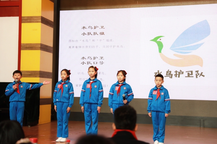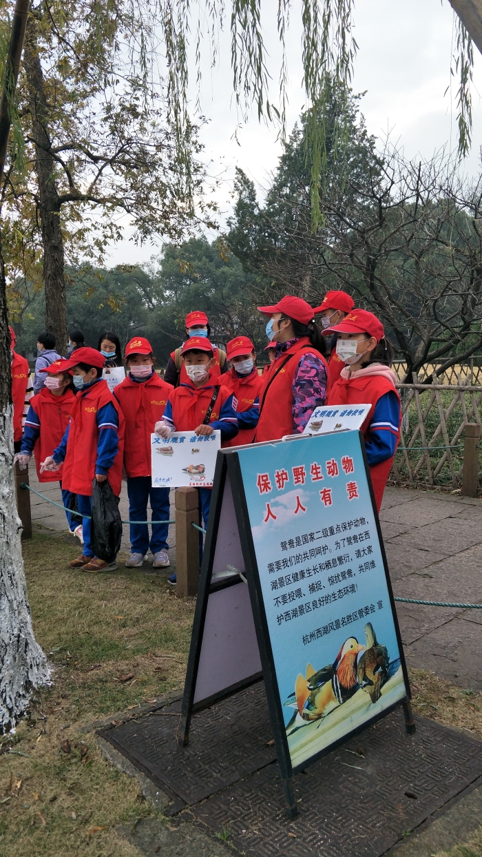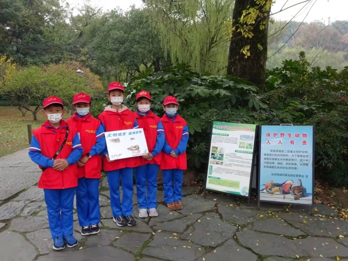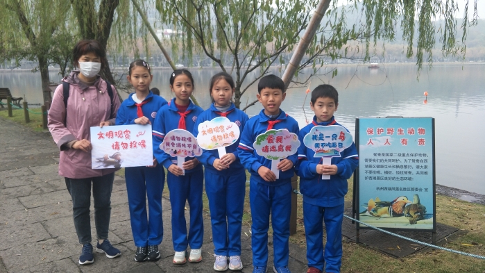 “水鸟护卫”小队:该小队由徐子皓,凡舒涵,江歆颖,杨思源,毛钰鑫这5位队员组成。他们是一群热爱大自然的少先队员,利用假期经常来到西湖边保护水鸟,呼吁过往的行人不投喂、不抓捕。同时还会力所能及捡拾肉眼可见的垃圾,用自身行为提醒身边的人不乱扔垃圾,呼吁大家讲文明,保护环境,让更多的候鸟来西湖越冬。还邀请了浙江野鸟会的老师,进一步讲解有关西湖水鸟的种群、生活习性等知识。每年来西湖的游客很多,他们也希望通过宣传将保护水鸟的意识扩散到全国各地。