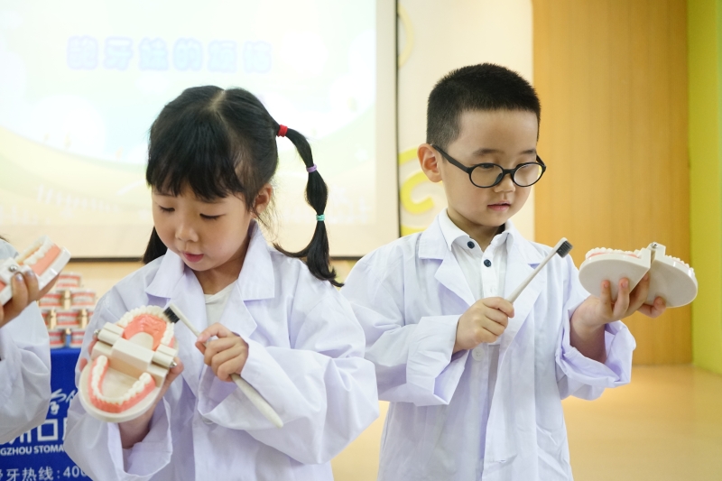 吴医生还请小朋友们上来当一当小牙医,穿上白大褂,给“牙齿模型”刷刷牙!碰到刷牙方法不对的小朋友,医生耐心的手把手指导。小朋友学得可认真了!因为待会儿“小牙医们”还要教其他小朋友如何正确的刷牙。