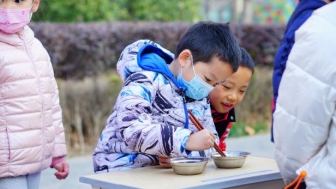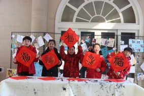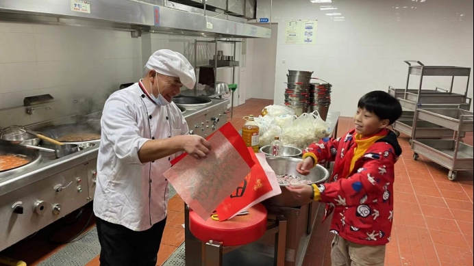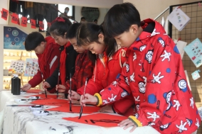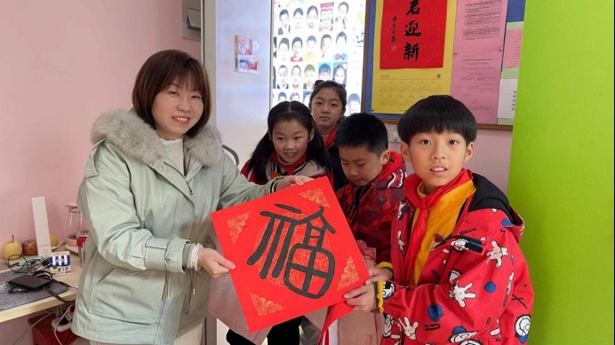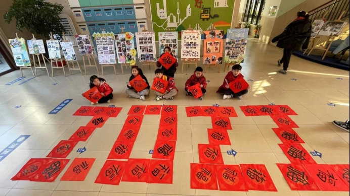 操场上是阵阵欢笑,大厅里则是融融暖意。学校通过广发“英雄贴”召集了一批小小书法家,小书法家们通过手中的毛笔将这份新年的祝福融进了一张张福中。一个个吉祥如意的福字写出了大家对于2022的美好憧憬与期待,送去新小孩对于美好生活的心愿与祝福。最后孩子们将亲手书写的福字送给老师与后勤工作人员,表达着自己的感谢与祝福。