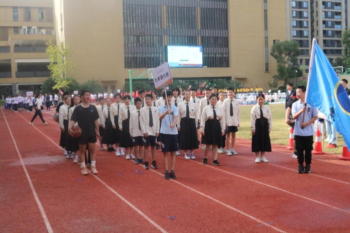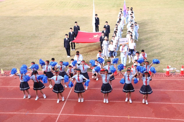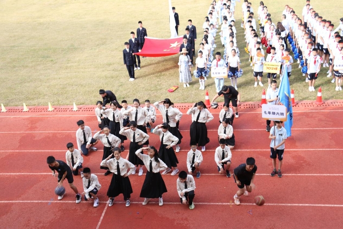 抬头,是白云点缀而成的蓝天。低头,是一片五彩斑斓。同学们的服饰各不相同。心却向着一处。音乐响起,一个接一个的班级昂首镶嵌走去。入场式的表演虽然只有短短三分钟,却是每一位同学、老师与家长倾注大量心血凝聚而成。昙花用尽一生,只为绽放的那一瞬间,是不断的练习,成就了表演时的精彩。