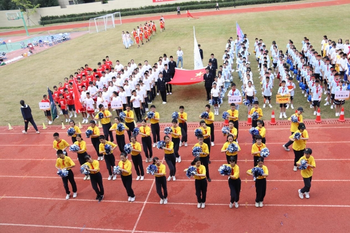 激昂的乐曲声响起,庄严的国旗队正步走来,整齐有力的步伐显露出少年的意气。伴着时代的鼓点,鲜艳的五星红旗走进田径场。