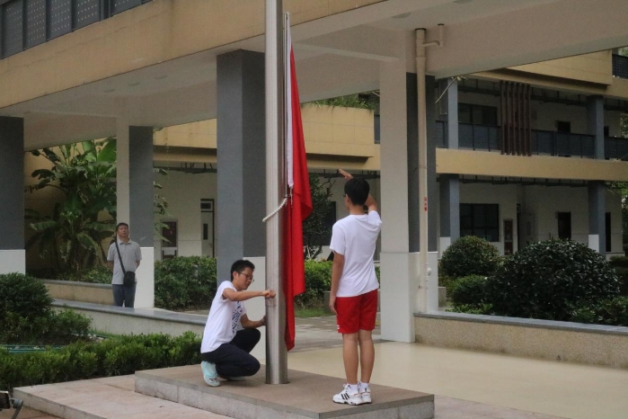 伴随着雄壮的国歌,鲜艳的五星红旗在校园上空缓缓升起,全体师生起立,行注目礼和队礼,庄严肃穆。