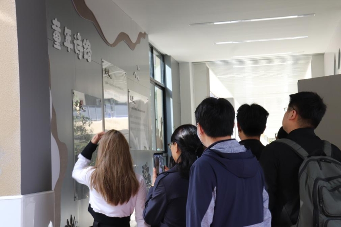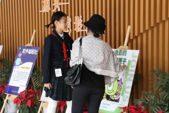 接着,与会代表团步入学校门厅,跃入眼帘的是“世界诗歌源头缩影”和“个性化课程展示”。墙上印刻的来自不同国家的诗歌集为校园空间增添了一份诗意,异彩纷呈的个性化课程海报展示了文晖实验丰富的课程架构。田亦安同学和席兴雅同学分别讲述了她们在剪纸社和戏剧社的故事,对于她们而言,参加个性化课程不仅有益于激发想象力,还能够提升审美原创力。两位同学的讲述娓娓动听,与会代表们纷纷称赞。沿着长廊,一幅幅学生作品彰显着学校以生为本的理念,诗歌之路的画卷也渐趋延展开来。诗歌之路是学校美育体系建设中的关键一环,一方面,学校以全球化视野和历史纵深感来设计“世界诗歌源头缩影”,关注不同国家、地区的诗歌起源;另一方面,围绕童年、少年、青年三个人生阶段来设计“成长诗路”,引导孩子们与诗同行。