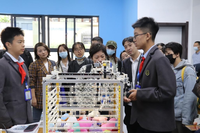 走进智力运动中心,充满科技感的机器人热情迎接着与会的来宾们。该中心共设置四大功能区,包括编程空间、赛事空间、行知空间、工程空间,配备纳茵特积木式教育机器人、竞赛机器人、大疆的无人机等人工智能普惠教育产品,功能涵盖多场景组合需求,满足理论教学、编程教育、工程实践、跨学科研究等不同的教学场景,服务于学生们的竞赛需求。与会代表们驻足于垃圾分类机器人等产品前,观摩机器人的精彩演示,倾听社团学生的详细介绍,频频点头称赞。智力运动中心着力培养学生的科学探索和创新能力,展示了文晖实验的科技特色,彰显了文晖实验自由创新的精神内核。