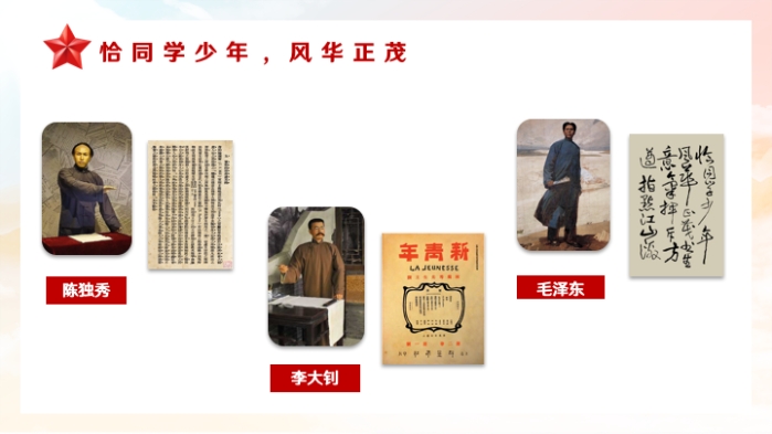 36岁的陈独秀,在《敬告青年》一文劝勉青年:“青年如初春,如朝日,如百卉之萌动,如利刃之新发于硎,人生最可宝贵之时期也。青年之于社会,犹新鲜活泼细胞之在人身。”27岁的李大钊,在《新青年》上疾呼:青年循蹈乎此,本其理性,加以努力,进前而勿顾后,背黑暗而向光明,为世界进文明,为人类造幸福,以青春之我,创建青春之家庭,青春之国家,青春之民族,青春之人类,青春之地球,青春之宇宙。”32岁的毛泽东,伫立橘子洲头,忆往昔:“恰同学少年,风华正茂;书生意气,挥斥方遒。指点江山,激扬文字,粪土当年万户侯。”他们是时代中的青年,点燃了希望的火种,引领了中国前进的方向。
