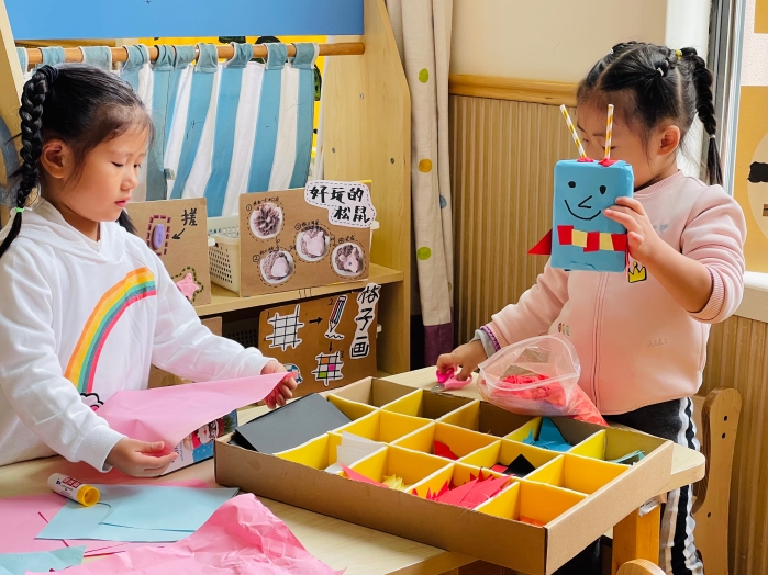 不起眼的“垃圾”可以变成好玩的区域玩具?这不,中班的孩子们利用收集到的可回收垃圾进行了二次加工,结合区角活动将一件件平凡的“垃圾”变身好玩的区域材料。瞧!快递盒中的气泡袋在孩子们的手中刷上鲜艳的颜料,变成了一个个美味可口的水果,而小小快递盒则被重新组合,粘贴成可爱的环保机器人,别出新意、独一无二。