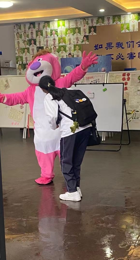 王丽阳老师:“啊,王老师那只熊原来是你!”“早晨我都没抱到,好可惜!”这是同学们发现玩偶服下是我后的对话。心理健康活动周,给同学们送去拥抱,作为教师真的感觉意义非凡。有些羞涩的同学会拍拍我玩偶的手,有些外向的同学会给你一个大大的拥抱。作为班主任有些同学发现是我之后,会特意会从班级跑出来给我拥抱,那一刻真的感觉很温馨。从玩偶服的小洞中发现他们自信阳光的笑脸,看到了属于他们的青春与活力。这次活动与其说我给学生送去快乐,不如说他们让我收获了心里的温暖!