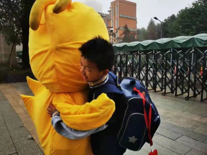 张芝琳妈妈:学校心理健康周,有幸做自愿者,变身一只大黄鸭,给同学们一个个拥抱,自己也好开心!很开心,很幸福,第一次收获那么多拥抱。
