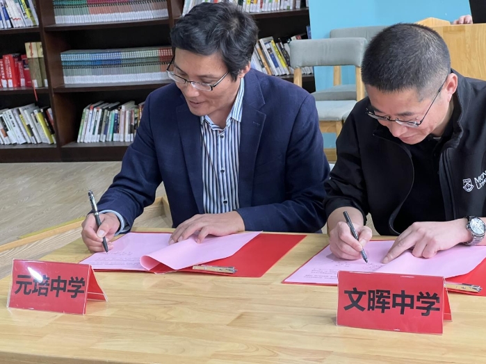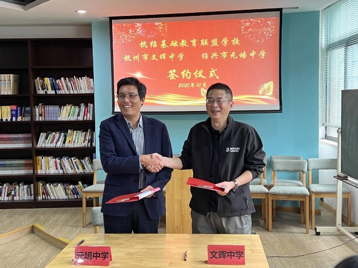 在学校四楼阅览室,姚琪翔校长与裘洪平校长签署了《杭绍基础教育联盟学校协议书》,期间两校老师共同欣赏了文晖师生创意拍摄的庆祝建党100周年《不忘初心》MV;姚校长向元培中学领导和老师介绍文晖中学的发展理念、办学特色和办学业绩,并殷切地希望作为杭绍联盟结对学校,在省统一命题趋势下,两校能相互支持,优势互补,组团共建,信息共享,共谋发展。