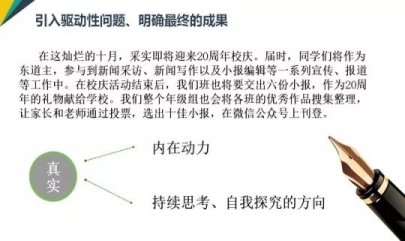 项目化学习非常注重创建真实的驱动性问题和成果,校运动会持续时间长,内容又丰富多彩,可看性强,学生的参与面又很广,我们将新闻活动探究单元的教学和校运会结合,使他们主动投入到活动探究单元的学习中。整个过程中,教师基于新闻阅读的知识,组织学生活动,帮助学生在真实的情境中真切地体验形成。