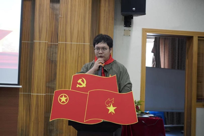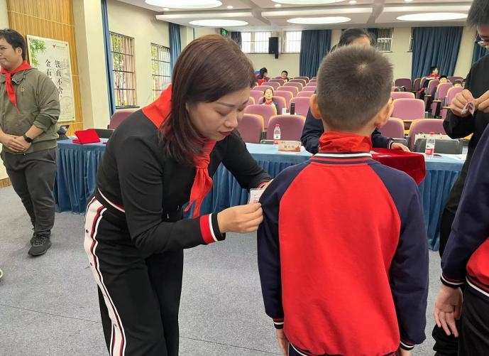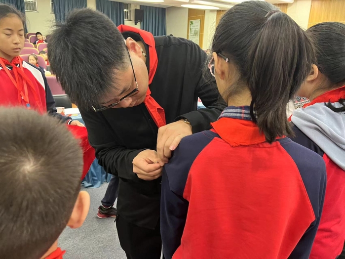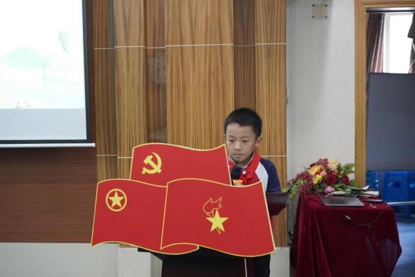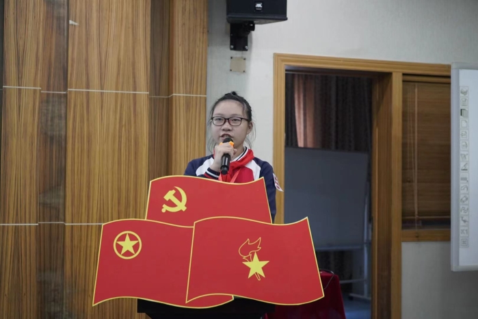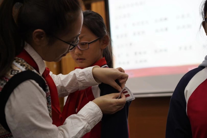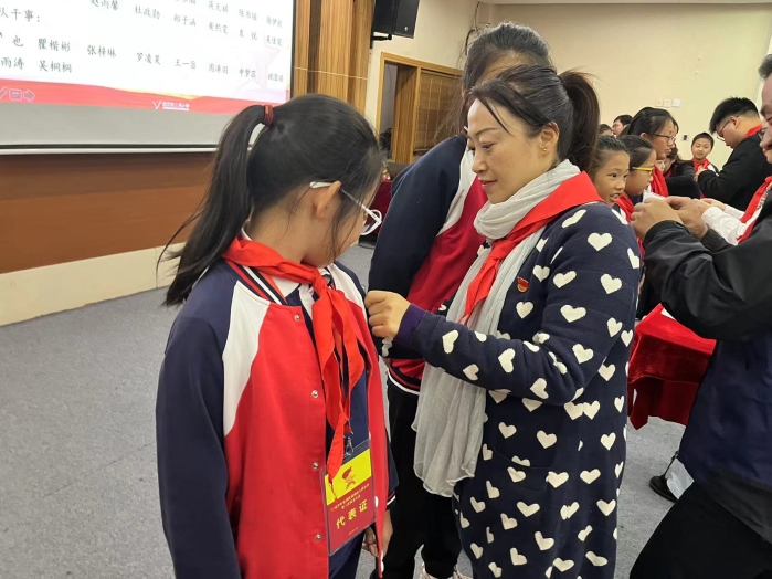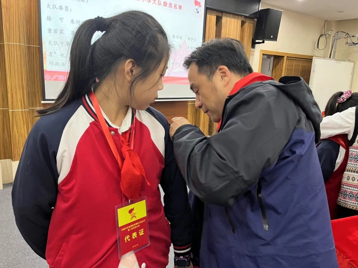 新当选大队委员代表唐家灏同学作了发言,表达自己的决心和目标。在场的领导还给2021学年度学校大队委员会委员们佩戴标志。