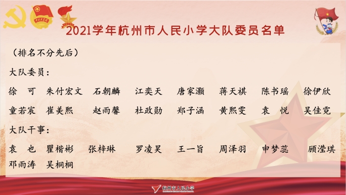 本次少代会的两项重要议程,即选举第三届少工委委员,以及通过中国少年先锋队杭州市人民小学2021学年度大队委员会委员候选人名单。经过投票表决,廖红、徐晓燕、黄永尧等15名同志当选为中国少年先锋队浙江省杭州市人民小学第三届工作委员会委员!唐家灏、江奕天、石朝麟等16名少先队员当选为本年度大队委员会委员!