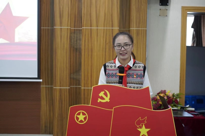 新当选少工委主任廖红为全体少先队员送上了寄语。廖主任首先对到场的领导和全体师生表达由衷的感谢,感谢大家对学校少先队工作的关心和支持。并语重心长的给全体少先队员提出期望——寻力、蓄力、发力,即寻找榜样,激励自己;蓄积力量,成长自己;抓住时机,展示自己。相信,在廖主任的引领下,杭州市人民小学少先队工作定能蓬勃向上。