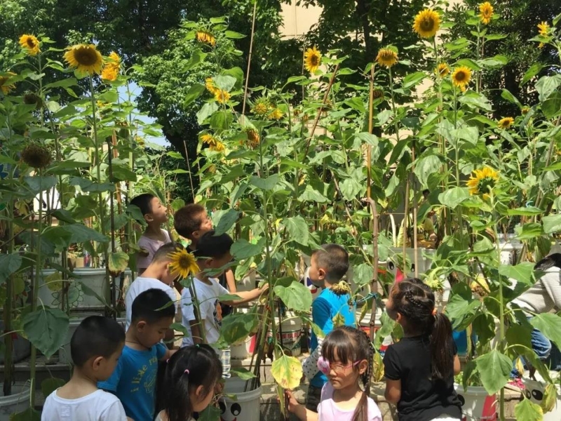 有着高大的树木,可以带着孩子爬树、躺在树叶小路上仰望天空,开展一系列关于大树的活动。有一块大草地,孩子们可以躺在小山坡上晒太阳,躲在山洞里做游戏,探究着草地里的秘密。每年都会开展向日葵种植活动,在植树节撒下向日葵种子,孩子们学着照顾向日葵发芽、生长、开花、结果。每个班门口都有一块大平台,种着各种花花草草,大家每天都会去打理一番。