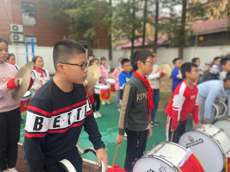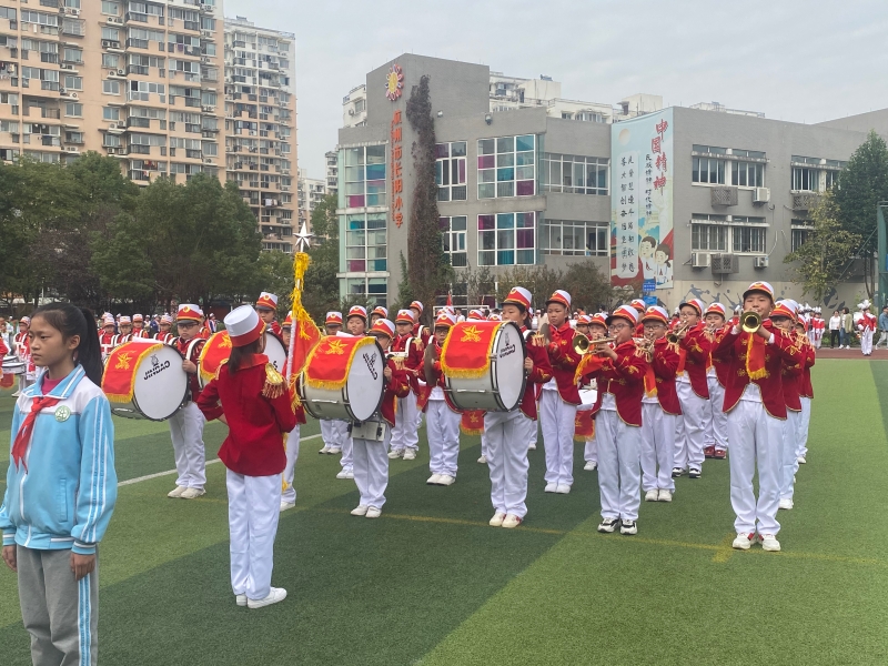 鲜红的着装在赛场上引人注目,队员们昂首挺胸、英姿飒爽地走进赛场,目不转睛地注视着指挥棒上的五角星,随着五角星的跳动,鼓手们高高扬起手中的鼓槌,铿锵有力地奏出鼓点,小号们鼓起圆圆的腮帮子,将号声吹的高亢。