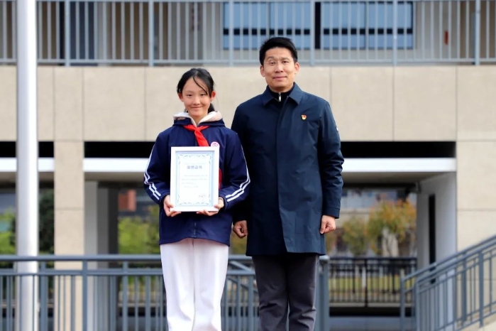 杨晓迪副校长为彭译萱颁发了我校特制荣誉证书,你闪亮的样子,真美!