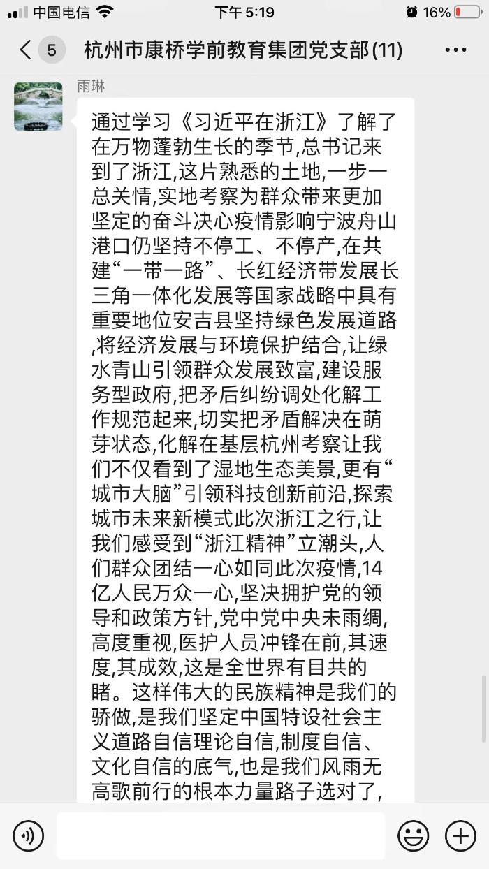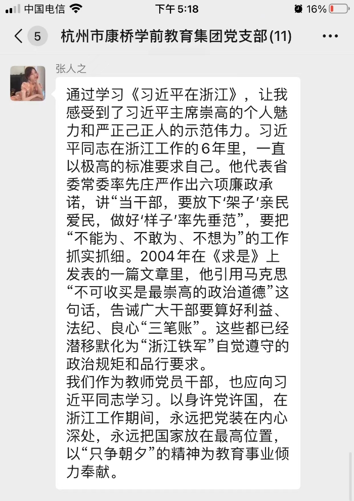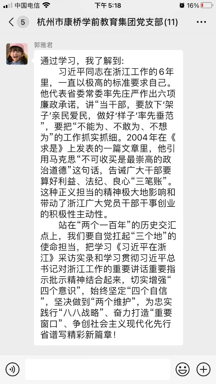 春风化雨,润物无声,浙江是习近平新时代中国特色社会主义思想重要萌发地。习近平同志在浙江工作期间率先垂范、大力倡导“求真务实”之风,已深深融入广大党员的血脉,《习近平在浙江》一书成为了我们学习的宝贵资源。2022年新年伊始,杭州市康桥学前教育集团党支部为各位党员送上了新年的第一份大礼“精神宝库”,同时也为2022年度的春训冬训拉开了帷幕。