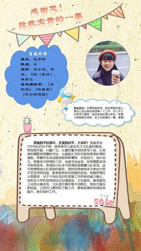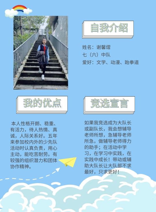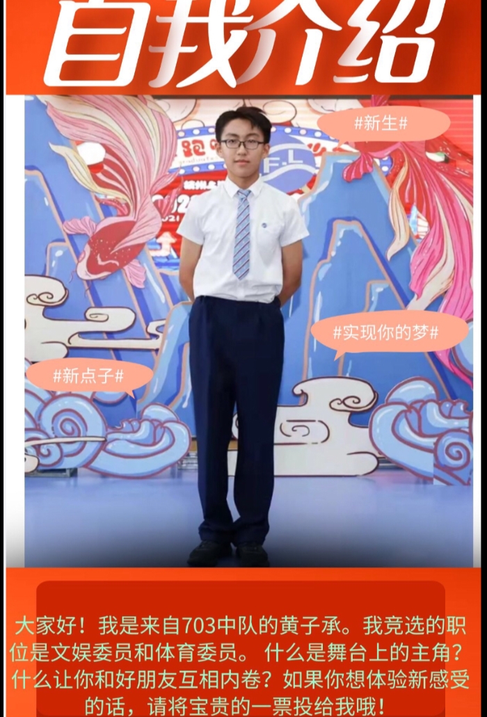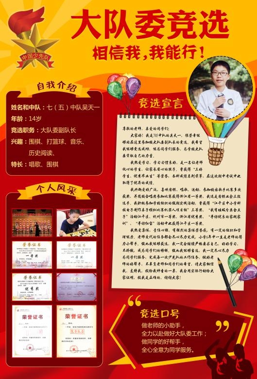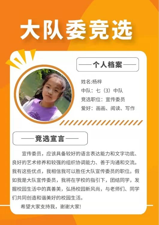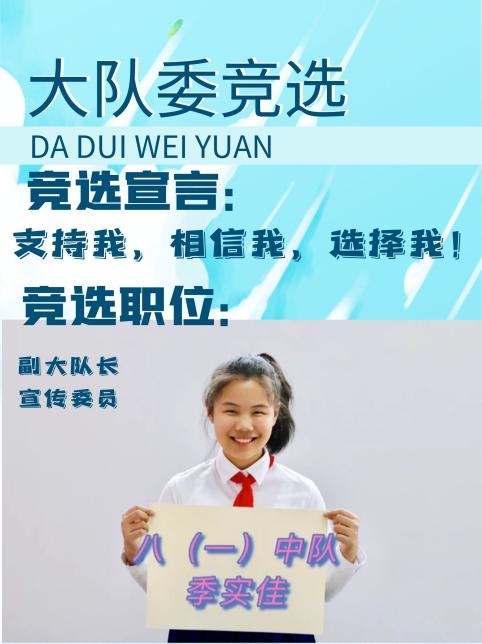 为了更好地展示个人风采,所有候选人精心制作了竞选海报。一张张图文并茂的精美海报,一句句决心坚定的竞选口号,表达了候选人对少先队工作的热忱,展现了候选人自信自强、积极向上的内心。为期一周的个人宣传阶段不仅让全校师生清楚地了解到每一位候选人的风采,更是让竞选人们成功圈了很多粉,激励了更多同学向他们看齐。