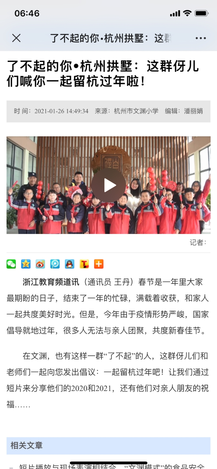 新年复始,万象更新,辛丑年春节的脚步日益临近,回家过年这是大家一年的期盼。因为疫情的原因,中央到地方都倡导大家就地过年。杭州市文渊小学响应号召,发出了“留杭过年”的号召,师生们也纷纷响应。学校还拍摄了“留杭过年”倡议视频,号召师生采用“云祝福”的方式向远方的亲朋好友,送去新春的祝福。