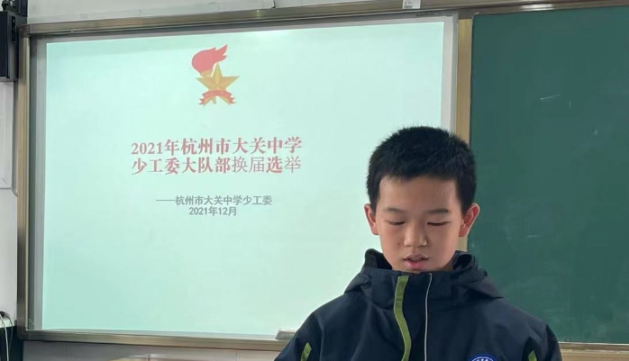 2021年12月5日,杭州市大关中学教育集团少先队代表们在两校区的报告厅隆重举行了“请党放心 强国有我”的少代会活动。