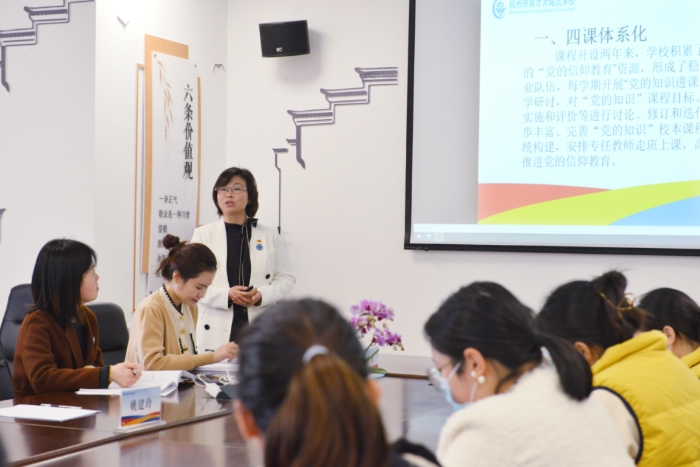 然后,由党组织副书记姚建玲代表学校作了题为《四课四化:杭州市育才大城北小学探索立起来的信仰教育》的工作汇报。姚书记向郁书记和全体老师汇报了学校在“党的知识”课程实施过程中坚持体系化、校本化、常态化、课程化等“四化”工作原则,落实讲好党的故事、唱好党的歌曲、了解党的知识、开展党的活动等“四课”教育内容、载体、策略和方法,把党的信仰教育全员、全程、全方位地融入学校教育,在学生心田播撒爱党、爱国的种子。